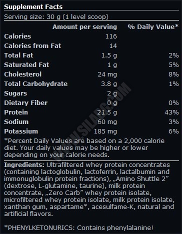 Съставки: протеинова матрица Anabolic Whey (микро-ултрафилтриран концентрат на суроватъчен протеин, микро-ултрафилтриран изолат на суроватъчен протеин, йонообменен суроватъчен протеинов изолат, хидролизирани суроватъчни пептиди), какаов прах, естествени и изкуствени аромати и оцветители, аспартам*, ксантанова смола.