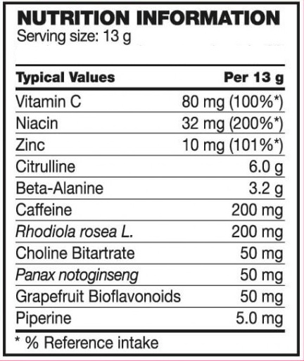 Съставки: L-цитрулин, бета-аланин, киселини (L (+) - винена киселина, лимонена киселина), агенти против слепване (силициев диоксид, калциев силикат), аромати, кофеин, L-аскорбинова киселина, екстракт от корен Rhodiola rosea ( Rhodiola rosea ), инулин, оцветители (куркумин), подсладители (сукралоза, ацесулфам К), холин битартрат, екстракт от корен на Panax Notoginseng, биофлаваноиден екстракт от грейпфрут (Citrus Paradisi, плодове), никотинамид, цинков оксид, екстракт от черен пипер (Piper Nigrum, плодове)
