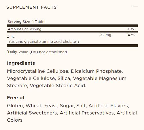 Съставки: Цинк (като аминокиселинен хелат на цинков глицинат), микрокристална целулоза, дикалциев фосфат, растителна целулоза, силициев диоксид, растителен магнезиев стеарат, растителна стеаринова киселина