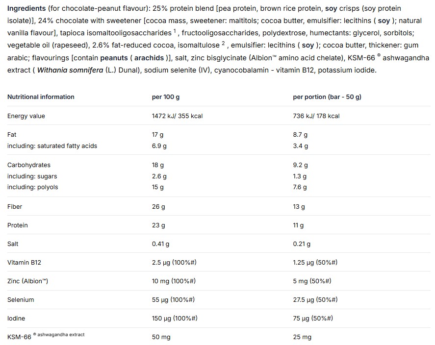Съставки: 32,1% протеинова смес (грахов протеинов изолат, бял оризов протеинов концентрат), фруктоолигозахариди, изомалтоолигозахарид*, 13,4% покритие с вкус на шоколад (подсладител-малтитоли; растителни мазнини (палма, палмови ядки, карите), какао с намалено съдържание на мазнини ( какаово масло 13%), емулгатор - лецитини (слънчоглед)), рапично масло, емулгатор - лецитини (соя); 3,4% какаови бисквити (оризово брашно, подсладител - малтитоли; царевично нишесте, палмова мазнина, какао, царевично брашно, инулин, слънчогледово олио, повдигащ агент - натриеви карбонати; сгъстител - ксантанова смола; сол, емулгатор - лецитини (слънчоглед); ароматизатор), овлажнител - глицерол; ароматизатор, сгъстител - натриева карбоксиметил целулоза; антиоксидант-богат на токоферол екстракт; подсладител - стевиол гликозиди. *Изомалтоолигозахаридът е източник на глюкоза. Произведено в завод, който произвежда мляко, яйца, соя, ракообразни, серен диоксид и ядки, съдържащи храни.