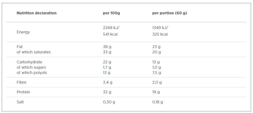 Съставки: протеинова смес (колагенов хидролизат, суроватъчен протеинов концентрат (от мляко)), мазнина от палмови ядки, 10% покритие с вкус на шоколад [подсладител - малтитоли; растителни мазнини (палма, палмови ядки, карите), 13% какао с намалено съдържание на мазнини (какаово масло 10-15%), емулгатор-лецитини (слънчоглед)], 10% какао, 9% вафла [пшенично брашно, пшенично нишесте, захар, стабилизатор - малтитоли; емулгатор - лецитини (соя); растителни масла (кокосово, соево), сол, цвят - E 150d; подсладител - ацесулфам К; ароматизатор, глюкозен сироп, регулатори на киселинността - натриеви карбонати, амониеви карбонати], стабилизатор - малтитоли; ароматизатори, подсладител - сукралоза