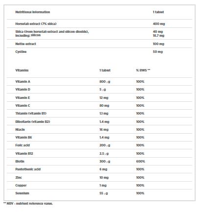 Комбинацията от екстракт от хвощ, екстракт от коприва и цистеин доставя ключови нутриенти за структурата на кожата и косата. Силицият, получен от растителни източници, има съществена роля в изграждането на съединителната тъкан. Витамините A, C, D и E действат като антиоксиданти и подпомагат обновяването на клетките, докато цинкът, медта и селенът са важни за поддържане на здрава кожа и нормален растеж на косата и ноктите. Биотинът и пантотеновата киселина също допринасят за добрия външен вид и здравословното функциониране на тялото.