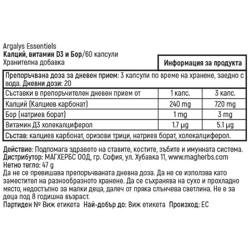 Calcium and Vitamin D3 от Argalys Essentiels е висококачествена хранителна добавка със съдържание на калций (калциев карбонат), подсилена с витамин D3, който е от съществено значение за фиксирането на калция в костите, и с подкрепяща доза бор.