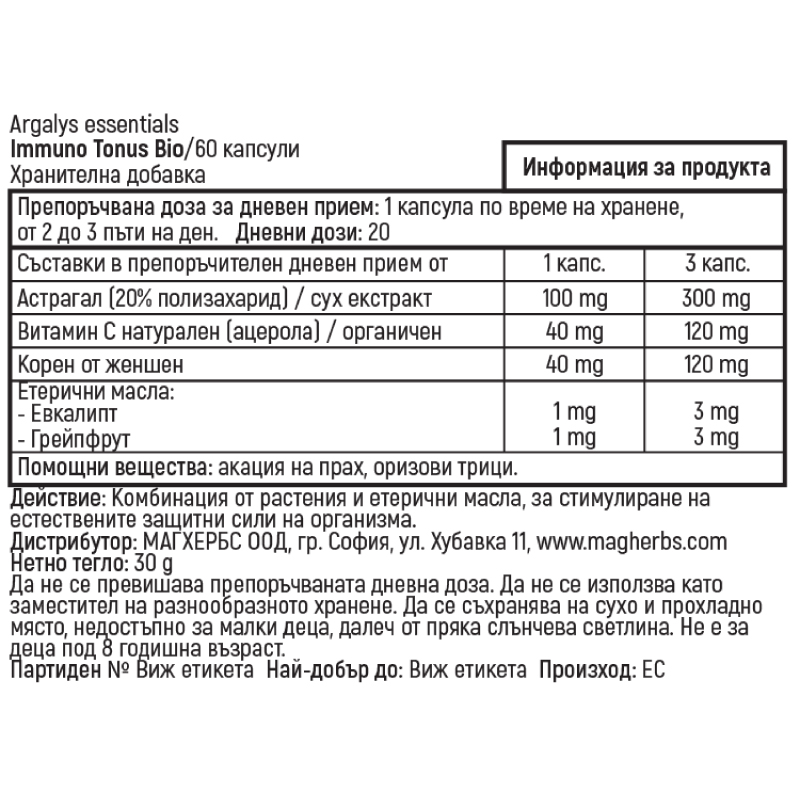 Immuno Tonus от Argalys Essentiels е висококачествено, естествено решение за подобряване на тонуса и имунната сила на организма. Продуктът представлява синергична комбинация от три растителни екстракта и две етерични масла, известни със своите адаптогенни свойства.