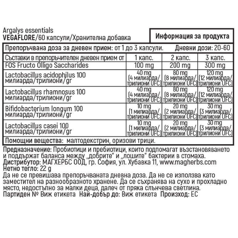 Vegaflore от Argalys Essentiels е усъвършенствана пробиотична добавка, експертно проектирана да поддържа и подобрява здравето на червата. Съдържащ мощна смес от 10 милиарда пробиотични бактерии в четири различни щама, Vegaflore е идеален за тези, които искат да поддържат здрава храносмилателна система и да подобрят цялостния баланс на чревната флора.