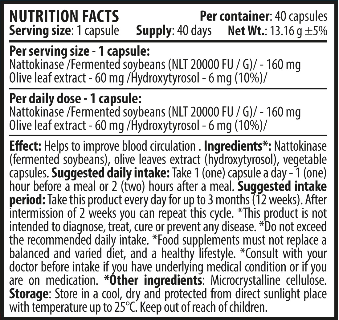 Съставки: Натокиназа (ферментирали соеви зърна), маслинови листа екстракт (хидрокситирозол), растителни капсули