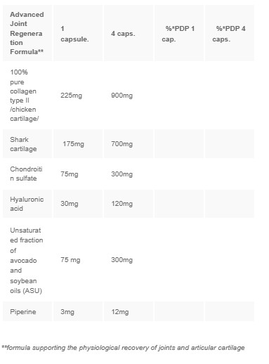 Съставки: 100% чист колаген тип II, Хрущял от акула, Хондроитин сулфат, Хиалуронова киселина, Полски хвощ, Aцерола, Пиперин