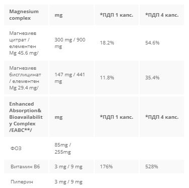 Съставки: Магнезиев цитрат, Магнезиев бисглицинат, Инулин, Витамин B6, Пиперин