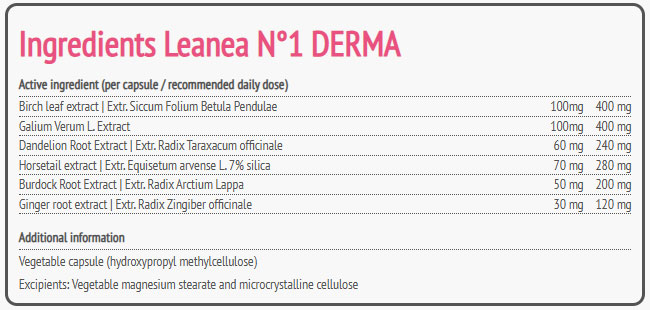 CELIPHARM Leanea No. 1 DERMA / 45 Caps подобрява еластичността на кожата и възвръща младежкия ѝ вид. Освен това подобрява лимфния поток и стимулира извеждането на излишни течности от тялото.