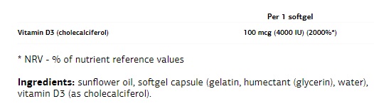 VPLAB Витамин D 4000 IU съдържат 4000 IU витамин D под формата на холекалциферол, поради което се препоръчват предимно на възрастни хора над 75-годишна възраст. Съставът им е обогатен със зехтин, който значително повишава усвояването на активната съставка.