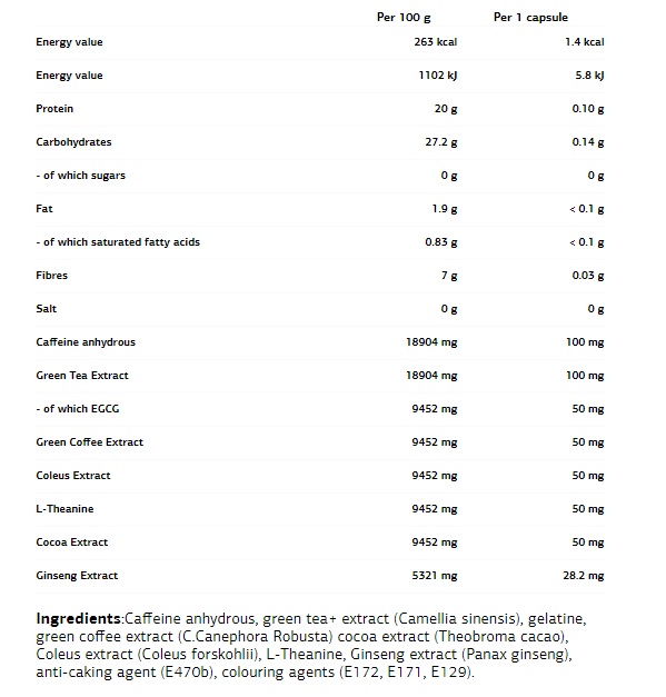 Съставки: екстракт от листа на зелен чай (Camellia sinensis L.), кофеин, хидроксипропил метил целулоза (обвивка на капсулата), екстракт от зърна на зелено кафе (Coffea arabica), екстракт от корен на колеус (Coleus forskohlii), екстракт от плодове на какао (Theobroma cacao), женшен (Panax ginseng) ) екстракт от корен, антислепващи агенти (магнезиева сол на мастни киселини, силициев диоксид)