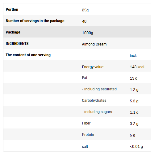 ALLNUTRITION не съдържа сол и е произведен без добавено палмово масло и добавени захари. Бадемовият крем е много ценна добавка към всяка здравословна диета и се препоръчва на всички.