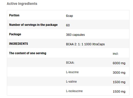 Незаменимите аминокиселини с разклонена верига L-левцин, L-изолевцин и L-валин (BCAA) под формата на капсули. Всяка дозапозволява възможно най-бързото доставяне на аминокиселините и всяка еднолитрова опаковка съдържа 80 000 mg BCAA. По време на интензивна физическа активност се наблюдава загуба на отделни аминокиселини, както и на други важни вещества. Аминокиселините са градивните елементи на всеки протеин. Достатъчният прием на качествен протеин, заедно с оптимален набор от аминокиселини, допринася за мускулния растеж. Аминокиселините с разклонена верига са сред незаменимите киселини, които организмът трябва да получава чрез храната, тъй като синтезът им от други източници не се осъществява в тялото.
