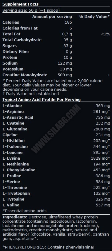 Съставки: декстроза, ултра - филтриран суроватъчен протеин концентрат (съдържащ лактоглобулин, лактоферин, лакталбумин и имуноглобулин протеинови фракции), малтодекстрин, креатин монохидрат, ксантанова смола
