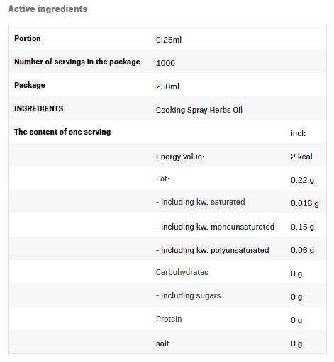 Това е перфектният контрол и ограничаване на ненужните калории в диетата ви. Спрей за готвене с билково масло е ароматна смес от подправки естрагон, мащерка, розмарин, риган и кимион. Комплектът от билки ще придаде на ястията ви отличителен вкус и аромат. Насладете се нанашия