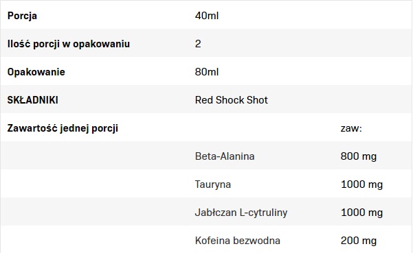 ALLNUTRITION Red Shock Shot отговаря на изискванията на най-взискателните спортисти. Осигурява ви 290 mg кофеин на една порция , който също така има термогенен потенциал. Бета-аланинът има благоприятни ефекти върху нервната система и сърдечно-съдовата система. Най-добре се използва с кофеин, защото укрепва неговия ефект.