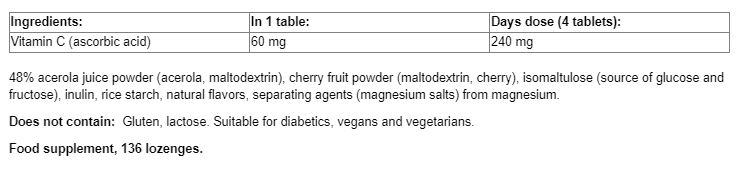 Съставки: 48% ацерола пудра от сок (ацерола, малтодекстрин) , череша пудра от плод (малтодекстрин, череша), изомалтулоза (източник на глюкоза и фруктоза), инулин, оризово нишесте, натурални аромати, разделителни агенти (магнезиеви соли от мастни киселини