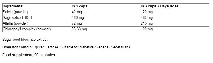 Съставки: Салвия (пудра), Салвия екстракт (10:1), Люцерна (пудра), Хлорофилен комплекс (пудра), Фибри от захарно цвекло, екстракт от ориз
