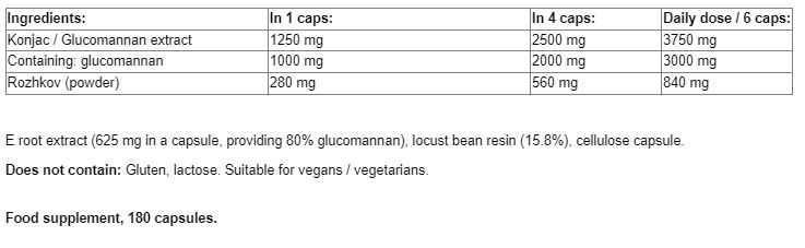 Съставки: Конджак/Глюкоманан екстракт, глюкоманан, Рожков (пудра), Eкстракт от корен, (смола от рожков), целулозна капсула