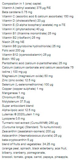 Съставки: Витамин А (ретинил ацетат), Бета каротен, Витамин С (аскорбинова киселина & калциев аскорбат), Витамин D (холекалциферол), Витамин Е (D-алфа токоферил ацетат), Витамин K (фитонадион), Витамин В1 (тиамин мононитрат), Витамин В2 (рибофлавин), Ниацин, Витамин В6 (пиридоксин хидрохлорид), Фолиева киселина, Витамин B12 (цианокобаламин), Биотин, Пантотенова к-на (калциев d-пантотенат), Калций (калциев карбонат и калциев аскорбат), Йод (калиев йодид), Магнезий (магнезиев оксид), Цинк (цинков оксид), Селен (L-селенометионин), Мед (меден сулфат), Манган, Хром, Молибден, Алфа-липоева к-на, Lutemax ® 2020 Лутеин, Ликопен, Куркума корен екстракт (CurcuWIN®), Зеаксантин (зеастаксин изимери), Астаксантин (Haematococcus pluvialis), бета-Криптоксантин, Бленд от плодове и зеленчуци (портокал кора, спанак, черен бъз, акай плод, черна боровинка, червена боровинка, нар, броколи, домати, грозде, морков, папая, ананас, карфиол, кале, ябълка, киви, тиквено семе, сао палмето плод), L-Аргинин, L-Глутамин, Холин, Инозитол, Силиций (силициев диоксид), Бор, Екстракт от гроздови семки (Vitis vinifera)