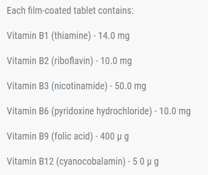 Съставки: Витамин B-1, Витамин B-2, Витамин B-3, Витамин B-6, Витамин  B-12,