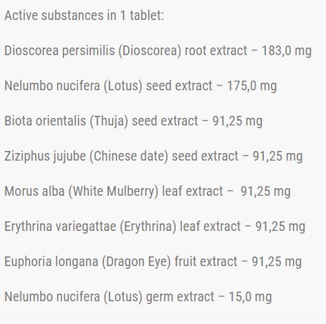 Съставки: Екстракт от коренище на Dioscorea persimilis (Диоскорея), Екстракт от семена на Nelumbo nucifera (Лотос), Екстракт от семена на Biota orientalis (Туя), Екстракт от семена на Ziziphus jujube (Китайска фурма), Екстракт от листа на Morus alba (Бяла черница), Екстракт от листа на Erythrina variegattae (Еритрина), Екстракт от люспи от плодове на Euphoria longana (Еуфория лонгана/око на дракон), Екстракт от зародиш на Nelumbo nucifera (Лотос)