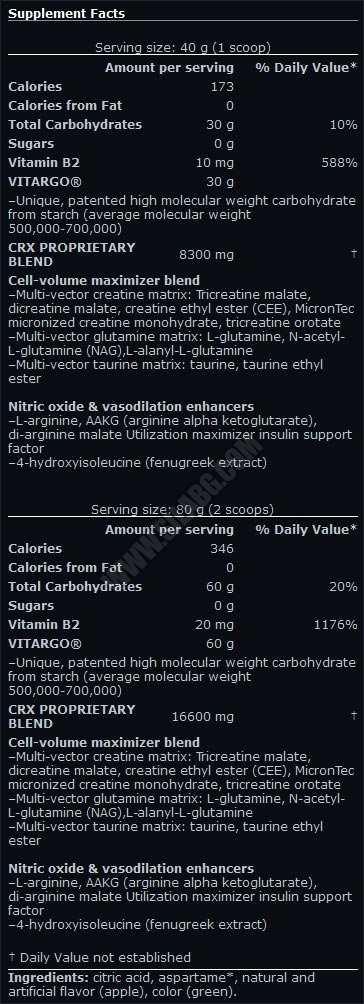 Съставки: патентован въглехидрат с високо молекулярно тегло, произведен от шведска царевична скорбяла, мултивекторна креатинова матрица: трикреатин малат, дикреатин малат, креатин етил естер (СЕЕ), МИКРОНТЕК микронизиран креатин монохидрат, трикреатин оротат, мултивекторна глутаминова матрица: L-глутамин, N-ацетил L-глутамин ( NAG), L-аланин L-глутамин, мултивекторна тауринова матрица: таурин, таурин етил естер комплекс подобряващ снабдяването с азотен окис и васкуларизацията, L-аргини, AAKG (аргинин алфа кетоглутарат), ди-аргинин малат, фактор, поддържащ максимално уползотворяване на инсулина, б4-хидроксиизолевцин (екстракт от детелина)