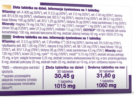 Съставки: Златна таблетка „Ден”. Състав: магнезиев малат, пълнител - микрокристална целулоза; 9,9% витамини (L-аскорбинова киселина – вит. С, никотинамид – ниацин, DL-алфа-токоферил ацетат – вит. Е, калциев D-пантотенат – пантотенова киселина, рибофлавин – вит. В2, пиридоксин хидрохлорид – вит. В6 , тиамин мононитрат – вит. B1, ретинил ацетат – вит. A, птероилмоноглутаминова киселина – фолат, D-биотин, холекалциферол – вит. D, цианокобаламин – вит. B12), 9,9% OXXYNEA® патентован плодово-зеленчуков комплекс (червен и бяло грозде, зелен чай, морков, домат, боровинка, броколи, зелено зеле, лук, чесън, пшеничен зародиш, грейпфрут, аспержи, папая, ананас, ягода, ябълка, кайсия, череша, портокал, касис, маслина, краставица), 9,9% екстракт от женшен, 5,9% екстракт от артишок, 4,9% екстракт от зелен чай, глазиращ агент – поливинил алкохол (PVA), полиетилен гликол, талк, калиев алуминиев силикат, полиоксиетилен сорбитан моноолеат; пълнител – омрежена натриева карбокси метил целулоза; железен бисглицинат (хелат на железната аминокиселина Albion®), манганов бисглицинат (манганов аминокиселинен хелат Albion®), натриев селенит, средство против слепване - магнезиеви соли на мастни киселини; хром (III) хлорид, калиев йодид, натриев молибдат (молибден (VI)), оцветители – титанов диоксид, железни оксиди и хидроксиди.