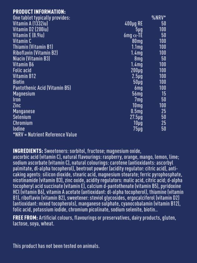 Съставки: Витамин А, витамин D2, витамин Е, витамин С, витамин В1, витамин В2, витамин В3, витамин В5, витамин В6, фолиева киселина, витамин В12, биотин, магнезий, желязо, цинк, манган, хром, селен, йод