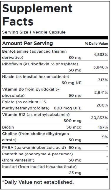 Съставки (в една капсула): Ниацин (от инозитол хексаникотинат) 50 mg, Витамин В6 (от пиридоксал 5-фосфат) 25 mg, Фолат (като калциев L-5 метилтетрахидрофолат) 400 mcg, Витамин В12 (като метилкобаламин) 250 mcg, Биотин 25 mcg 50 mcg, Холин (от холин дихидроген цитрат) 25 mg, Бенфотиамин (усъвършенствано производно на тиамин) 36 mg, PABA (пара-аминобензоена киселина) 25 mg, Пантетин (предшественик на коензим А) (от Pantesin® 55% пантетин) 25 mg, Инозитол (от инозитол хексаникотинат) 12.5 mg, Рибофлавин (от рибофлавин 5'-фосфат) 25 mg