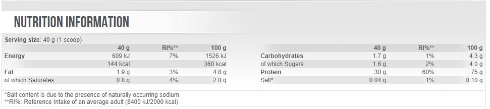 Съставки: Калциев казеинат (мляко) 58% [калциев казеинат (мляко), емулгатор: моно- и диглицериди на мастни киселини], незабавен суроватъчен протеин (мляко) 24% [концентрат на суроватъчен протеин (мляко), емулгатор: лецитини (соя)] Мляко на прах, какао на прах с намалени мазнини, сгъстител (ксантанова гума), желиращ агент (карагенан), аромати, подсладители (сукралоза, ацесулфам К)