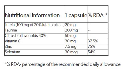 Съставки: таурин, цинков бисглицинат (Albion™ цинков аминокиселинен хелат) - цинк, екстракт от цитрусови биофлавоноиди, L-аскорбинова киселина - вит. C, лутеин от Tagetes erecta L., пълнител - микрокристална целулоза; натриев селенат (IV) - селен, средство против слепване - магнезиеви соли на мастни киселини; капсула (компоненти на черупката - желатин, цвят: E 171)
