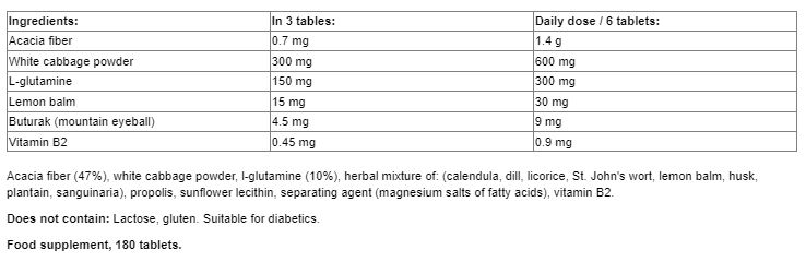 Съставки: Фибри от акация (47%), бяло зеле пудра, л-глутамин (10%), билкова смес от : (невен, копър, женско биле, жълт кантарион, маточина, хуск, живовляк, сангвинария), прополис, слънчогледов лецитин, разделящ агент (магнезиеви соли на мастни киселини), витамин В2