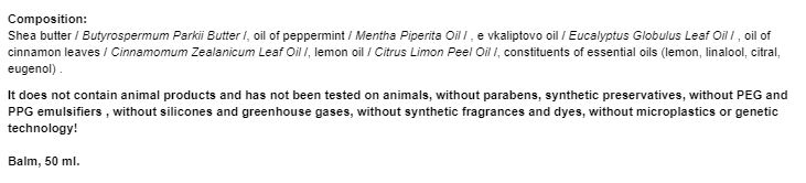 Съставки: Масло от шеа /Butyrospermum Parkii Butter/ , масло от мента /Mentha Piperita Oil/, eквалиптово масло /Eucalyptus Globulis Leaf Oil/, масло от канелени листа /Cinnamomum Zealanicum Leaf Oil/, лимонено масло /Citrus Limon Peel Oil/, съставни части от етерични масла (лимонен, линалоол, цитрал, евгенол)