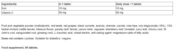 Съставки: Плодове и зеленчуци на прах (малтодекстрин, червено цвекло, червено грозде, касис, ацерола, Вишни, моркови, шипки, железен бисглицинат (16%), 15% билкова смес (листа от коприва, цвят от хибискус, лист от магданоз, плод от копър, бял равнец билка, амброзия, лист от къпина, полски хвощ, лист от къри , корен от цикория, червен кантарион, корен от сангвирания, корен от женшен), Л-Аскорбинова киселина, пшеничен декстрин,антислепващ агент: магнезиеви соли на мастни киселини