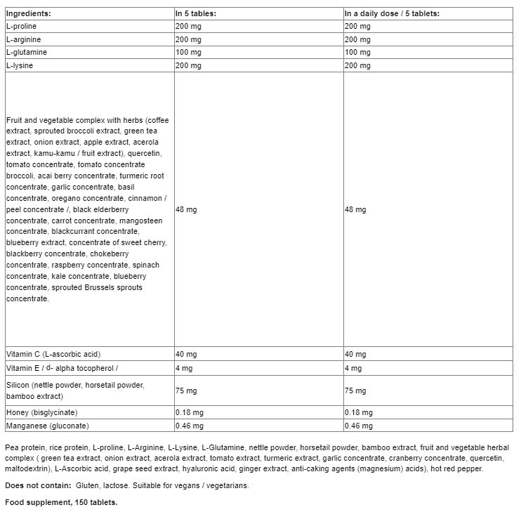Съставки: билков комплекс (екстракт от кафе, екстракт от покълнали броколи, екстракт от зелен чай, екстракт от лук, екстракт от ябълка, екстракт от ацерола, каму-каму /екстракт от плод/, кверцетин, концентрат от домат, концентрат от броколи, концентрат от акай бери, концентрат от корен на куркума, чесън концентрат, концентрат от босилек, концентрат от риган, концентрат от канела /кора/, черен бъз концентрат, концентрат от морков, мангостин концентрат, касис концентрат, боровинка екстракт, концентрат от сладка череша, къпина концентрат, арония концентрат, малина концентрат, спанак концентрат, кейл концентрат, синя боровинка концентрат, покълнало брюкселско зеле концентрат, Грахов протеин, оризов протеин, екстракт от гроздово семе, хиалурнова киселина, екстракт о джинджифил, антислепващи агенти (магнезиеви соли от мастни киселини), лют червен пипер.