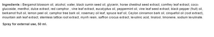 Съставки: Масло от цвят на бергамот, алкохол, вода, масло от семена на черен кимион, глицерин, див конски кестен екстракт от семена, ектракт от лист на черен оман, коко-глюкозид, ментол, екстракт от дулса (червено вородрасло), камфор, екстракт от лозови листа, масло от евкалипт, масло от мента, екстракт от семена на лозови листа, масло от черен пипер (плод), масло от плод на беркамот, масло от лимонена кора, масло от кора на камфорово дърво, масло от розмарин лист, масло от лист на смърч, масло от кора на цейлонска канела, масло от жълта тинтява (екстракт от корен), екстракт от лист на планински ясен, безстъблена решетка екстракт от корен, смола от смирна, екстракт от шафранов минзухар, левулинова киселина, линалол, лимонен, натриев левулинат