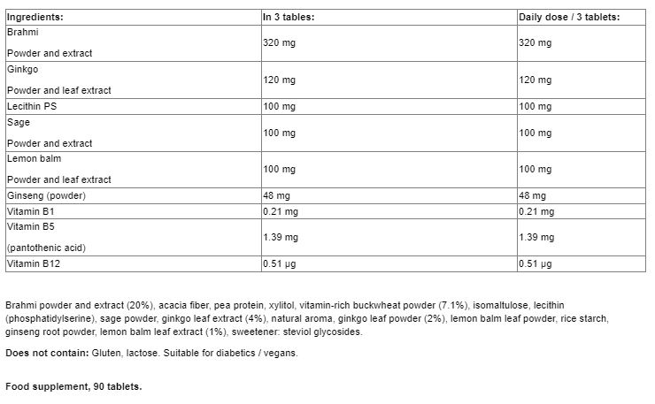 Съставки: Екстракт от брахми (20%), фибри от акация, грахов протеин, ксилитол, богат на витамини прах от зародиш от елда (7,1%), изомалтулоза*, лецитин PS (фосфатидилсерин), прах от листа на градински чай, екстракт от листа на гинко (4%), натурален аромат, прах от листа на гинко, екстракт от листа на градински чай (2%), листа от маточина на прах, оризово нишесте, корен от женшен на прах, екстракт от листа на маточина (1%), подсладител: стевиол гликозиди