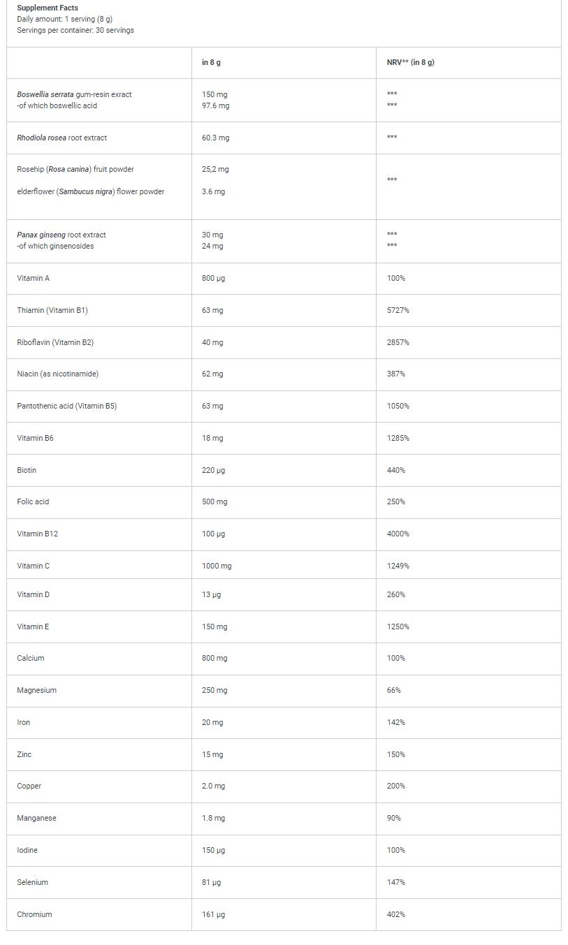 Съставки: калциеви соли на ортофосфорна киселина, L-аскорбинова киселина, киселина (лимонена киселина), малтодекстрин, ароматизатори, DL-алфа-токоферил ацетат, магнезиев оксид, железен глюконат, индийски тамян (Boswellia serrata) смола от смола 1,87%, сладка смола 1,87%, сукрала ), тиамин мононитрат, D-пантотенат, калций, никотинамид, екстракт от корени на родиола (Rhodiola rosea) 0,8%, агент против слепване (силициев диоксид), рибофлавин [рибофлавин, пълнител (хидроипропил метил целулоза [rosehip)], билков препарат Rosa canina) плодов прах 0,32%, цвят от бъз (Sambucus nigra) цвете на прах 0,05%], екстракт от корени на корейски женшен (Panax ginseng) 0,4%, пиридоксин хидрохлорид, цинков оксид, натриев селенит, меден глюконат, цианокобаламин [стабилизер (ацетогубаламин, ретинил) арабски), ретинил ацетат, антиоксидант (алфа-токоферол), средство против слепване (калциеви фосфати)], манганов сулфат, холекалциферол, хром (III) хлорид, калциев-L-метилфолат, D-биотин, калиев йодид
