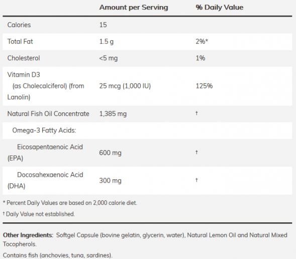 Този концентрат от рибено масло е произведен при строги стандарти за контрол на качеството. Той е тестван за липса на потенциално вредни нива на замърсители като полихлорирани бифенили, диоксини, живак и други тежки метали. Продуктът използва рибен желатин, който е алтернатива на желатините от говеждо и свинско месо, овкусен е с лимоново масло и е подсилен с 1000 IUs витамин D-3.