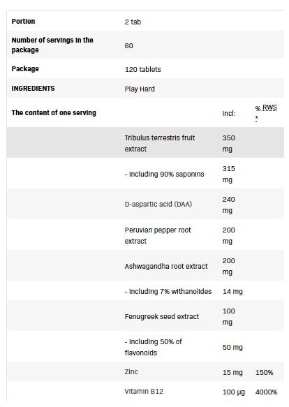 Съставки: Бабини зъби Екстракт от плодове /Tribulus terrestris/, включително 90% сапонини, D-аспарагинова киселина (DAA), Перуански пипер Екстракт от корен, Екстракт от Ашваганда корен, включително 7% витанолиди, Сминдух семена екстракт, включително 50% флавоноиди, Цинк, Витамин В12