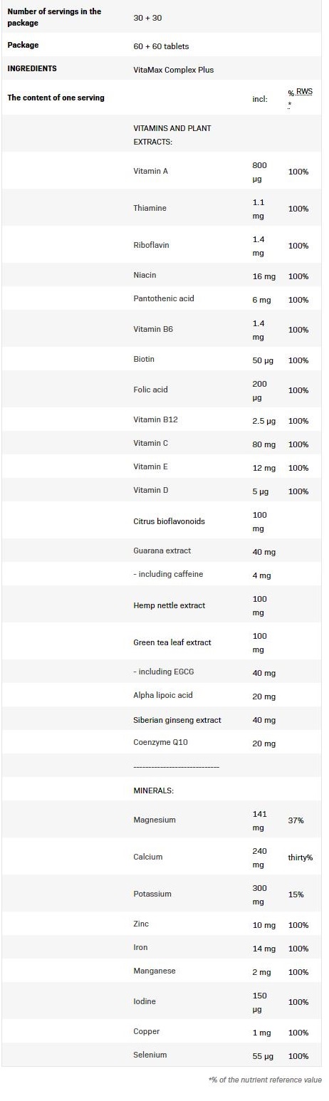 Съставки: цитрусови биофлавоноиди, екстракт от конопена коприва Urtica cannabina L., екстракт от листа на зелен чай Camellia sinensis, L-аскорбинова киселина, екстракт от сибирски женшен Eleutherococcus senticous, екстракт от Paullinia guarana cupana, антислепващ агент: силициев диоксид, антислепващ агент: магнезиеви соли на мастни киселини, носител: калциев фосфат, алфа-липоева киселина, коензим Q10, никотинамид, D-алфа токоферол, пантотенова киселина, пиридоксин хидрохлорид, рибофлавин, тиамин мононитрат, ацетат ретинил, птероилмоноглутаминова киселина, D-биотин, холекалциферол, цианокобаламин