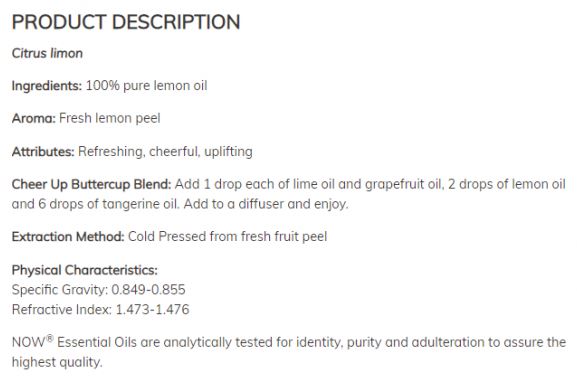 NOW Lemon Oil / 30 ml е студенопресовано, като по този начин са запазени абсолютни всички полезни свойства на лимона. Освен това не съдържа ГМО и не е тествано върху животни.