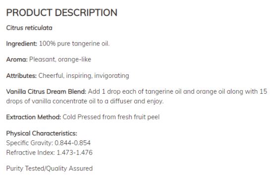 NOW Tangerine Oil / 30 ml е студено пресовано, като по този начин са запазени абсолютни всички полезни свойства на мандарината. Освен това не съдържа ГМО и не е тествано върху животни.