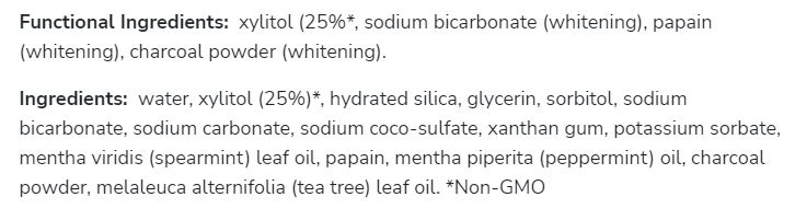 Съставки: ксилитол (25%, натриев бикарбонат (избелване), папаин (избелване), въглен на прах (избелване)