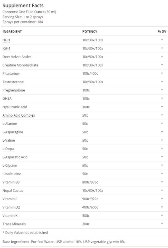Съставки: hgh, igf-1, еленов кадифен рог, креатин монохидрат, pituitarium, тестостерон, рибоза, dhea, прегненолон, хиалуронова киселина, комплекс от аминокиселини, l-аланин, l-аспарагин, l-валин, l-допа, l-глицин, l-изолевцин, l-аспарингова киселина, кактус нопал, витамин В9, витамин С, витамин K, витамин D2, микроелементи. Основни съставки: пречистена вода, usp алкохол 10%, usp растителен глицерин 8%
