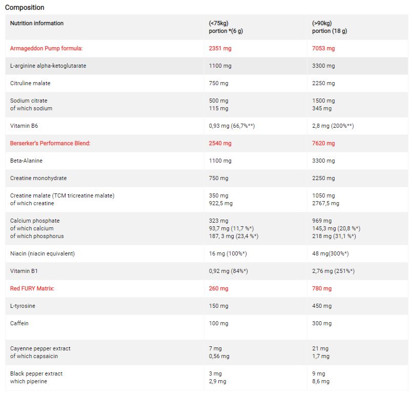 Състав: бета-аланин, L-аргинин алфа-кетоглутарат, цитрулин малат, креатин монохидрат, натриев цитрат, лимонена киселина - регулатор на киселинността, креатин малат, калциев фосфат, аромати, силициев диоксид - средство против слепване, L-тирозин, ябълчена киселина - регулатор на киселинността; ацесулфам к, сукралоза - подсладители, никотинамид - ниацин, екстракт от лют червен пипер (Capsicum annuum L.), екстракт от черен пипер (Piper nigrum L.) Биоперин, пиридоксин хидрохлорид - вит. B6, тиамин хидрохлорид - вит. B1