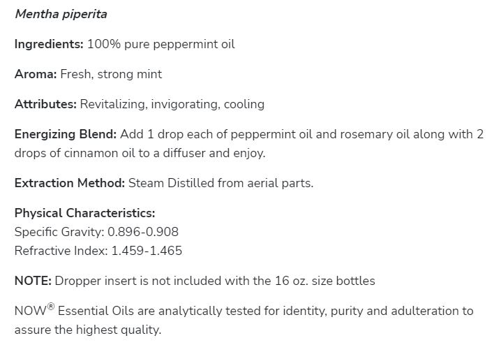 NOW Peppermint Oil – висококачествено етерично масло с екстракт от мента с възстановяващ, ободряващ и охлаждащ ефект. Продуктът не съдържа синтетични аромати и химикали, и като всички останали продукти от серията NOW Essential Oils, не е тестван върху животни!