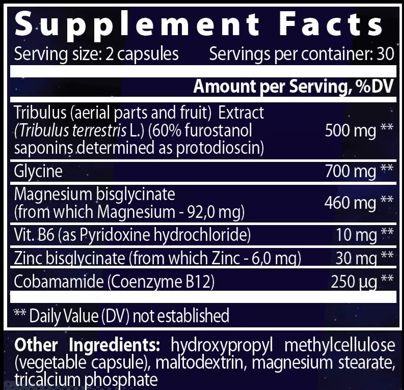 Съставки (в една капсула): 250 мг. сух екстракт от български трибулус терестрис, със съдържание на 60% фуростанолови сапонини, 350 мг. глицин, 230 мг. магнезиев бисглицинат (от който магнезий - 92 мг.), 5 мг. витамин В6 (като пиридоксин хидрохлорид), 15 мг. цинков бисглицинат (от който цинк – 6 мг.), 125 ug витамин B12