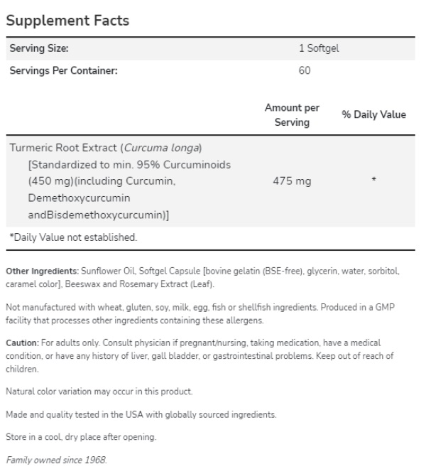 Съставки: екстракт от корен на куркума (Curcuma longa) [Стандартизиран до мин. 95% куркуминоиди (630 мг.) (включително куркумин, деметоксикуркумин и бидеметоксикуркумин)]